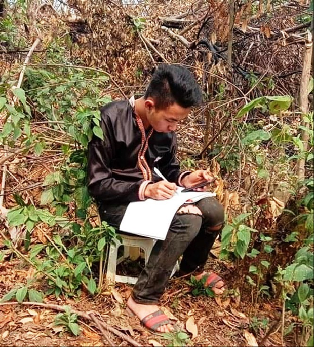 Sùng A Sì tranh thủ học bài trên rừng.